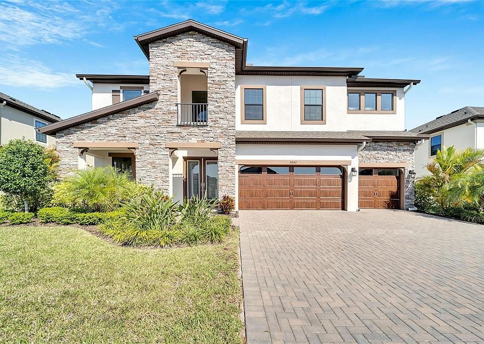 PRICE REDUCED!!! This stunning two-story West Bay Home is located in the upscale GATED community of Legacy Ridge! From the moment you enter the double glass doors into the foyer, you will appreciate this opulent property full of modern upgrades. This property has been carefully maintained and shows like a MODEL HOME. Nicely equipped with 5 bedrooms, 4 full bathrooms, HUGE bonus room, with a large 3 car garage. In the kitchen you will find exquisite light Shaker Cabinets with crown molding, QUARTZ countertops and a HUGE ISLAND perfect for entertaining. Further refinements include an extended Mosaic glass backsplash, frosted glass pantry door, and upgraded GE appliances, including a GAS range. The living space has been designed with incredible attention to detail including EXTENDED SLIDING GLASS DOORS that floods the home with natural light. The huge extended lanai has been upgraded with a clear view screen with plenty of space for a large family or hosting a party. This PRIVATE back yard is pre-pool ready with gas and electric. The master bedroom is very private and luxurious with a 6 foot garden tub and huge walk-in closet. The large bonus room is ready for movie night and a pool table, and the secondary bedrooms are very spacious. The upgraded office is light and bright with beautiful French doors for privacy. Other upgrades include a brick paver driveway, 10’ ceilings, trey ceiling in entry, and large walk-in closets. Legacy Ridge is located within a mile of Burns Middle School, Bloomingdale High School, Sprouts, Walmart, Fitness Clubs, and plenty of restaurants and shopping. Come take a tour to experience this grandeur first-hand and discover a lifestyle made for luxury!