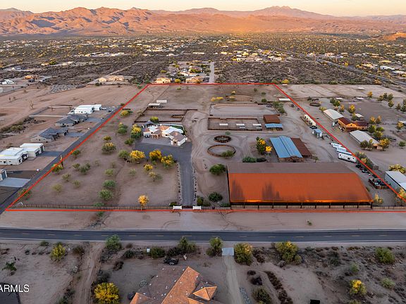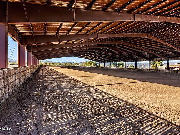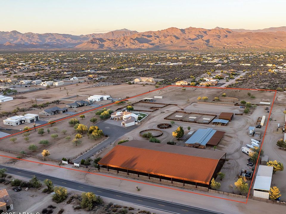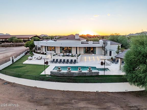 Sitting on nearly 20 acres with stunning mountain views, this equestrian estate exudes elegance and functionality. The recently remodeled main home features a timeless modern southwest design with high-end finishes throughout, 2 master suites, soaring ceilings, and abundant natural light. Expansive glass sliders open to a resort-style backyard oasis and roof deck. Overlooking exceptional equestrian facilities, perfect for a private ranch or boarding/training operation. New arena footing in both the outdoor roping arena and covered 140' x 240' arena. 24-stall main barn with 2 tack rooms, 2 casitas, 4-stall mare motel, and multiple large turnouts. Two Alterna Container homes provide staff quarters, plus 2 RV hook-ups on this fully fenced property. Prime location, no HOA, all paved streets.