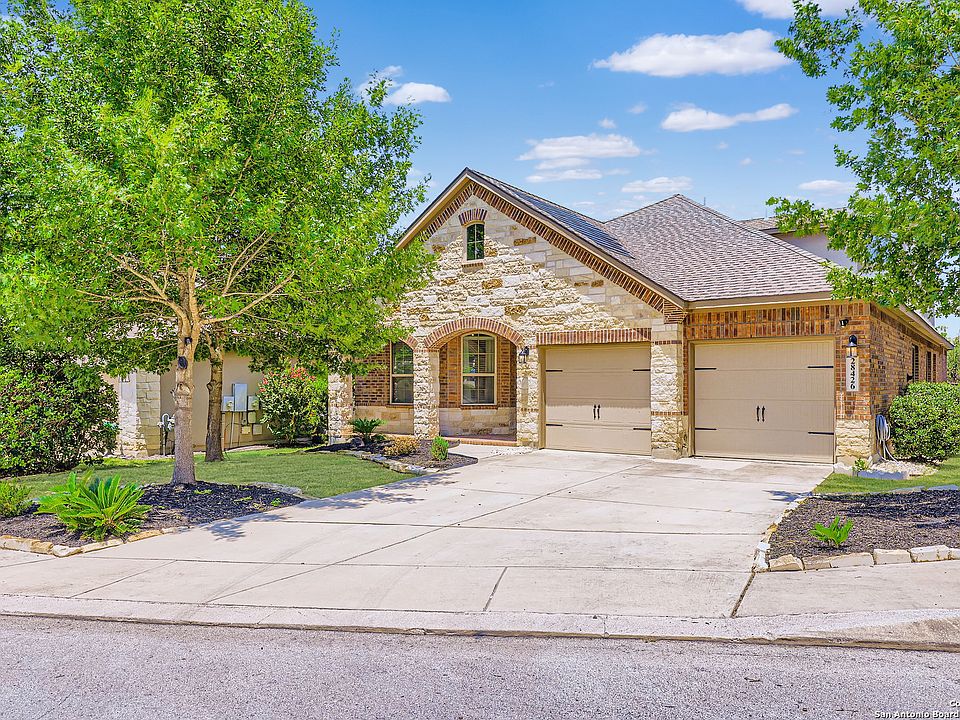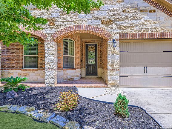 Step into this stunning 2,937 sq ft, 4-bedroom, 3-full bath home perfectly designed for modern living and multi-generational needs, nestled on a quiet cul-de-sac and greenbelt lot within a quaint, private gated community just off Highway 281, offering both tranquility and convenience. This thoughtfully crafted home features an open floor plan with tall ceilings throughout, and select rooms enhanced by elegant tray designs and rich beam accents, neutral paint, beautiful wood floors throughout (no carpet), and stone accents that add character. A dedicated home office, formal dining room, and upstairs private fourth bedroom with en-suite bath and bonus space ideal for a game room or second living area enhance its flexibility. The open-concept kitchen boasts granite counters, built-in double ovens, a five-burner stove, stainless steel appliances, ample cabinetry, and a large island with bar seating. The luxurious primary suite includes dual vanities, a garden tub, and a spacious wall-to-wall tiled shower. An all-brick and stone exterior, outdoor fireplace, water softener, tankless water heater, and eco-friendly, paid-off solar panels keep electricity bills under $150, highlighting the home's exceptional efficiency and quality, all in a highly desirable area zoned for acclaimed schools.