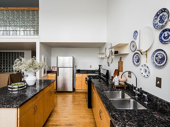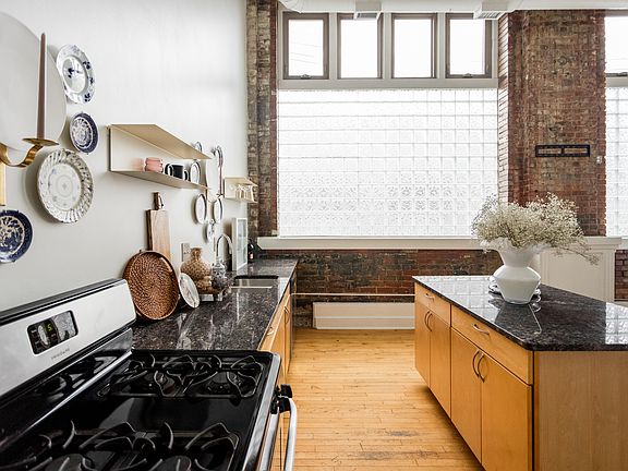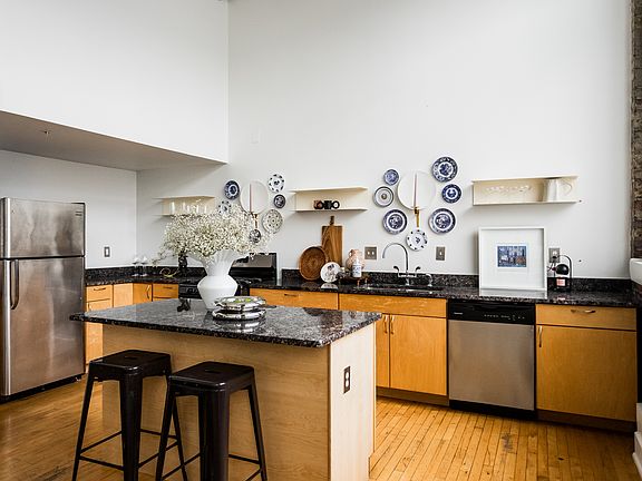 High ceilingsHardwood floorsExposed brickOpen conceptFlowing natural lightStainless steel appliances