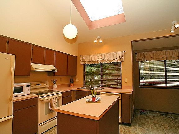 Spotless 2500+ square foot Alderdale home with dramatic vaulted ceilings, clerestory windows & indirect lighting. Brand new kitchen w/big skylight, new Samsung refrigerator w/ice and water in the door, new Samsung dishwasher, new Samsung range, new cabinets, new counters, new kitchen floor. New carpet in much of home. Big dining room w/gleaming oak floor. King master suite with walk in closet and adjoining bath + 2 more bedrooms. Office with built in cabinetry. Huge recreation/family room big enough for pool table plus sitting area w/fireplace, oak wet bar & refrigerator. New carpet and interior paint. Great location-walk to Twin Lakes shopping, Alderdale Park & Metro Park and Ride.