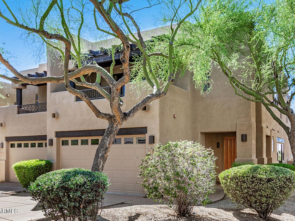 Become the proud owner of this fantastic 2-bedroom townhome in Troon North! Discover a captivating open layout with high ceilings, recessed lighting, a soothing palette, a harmonious blend of soft carpeting and tile flooring, and an inviting fireplace for relaxing evenings. The gourmet kitchen comes with staggered wood cabinetry with crown moulding, stainless steel appliances, and a two-tier peninsula with a breakfast bar. Upstairs, you'll find a quaint loft, providing a versatile space for work or relaxation. You'll also find dual primary bedrooms that boast balcony access, an ensuite with double sinks, and a walk-in closet for keeping an organized wardrobe. Unwind on either of the lovely balconies, where you can savor tranquil golf course and majestic mountain views. Make this yours!