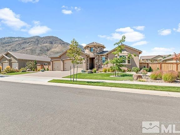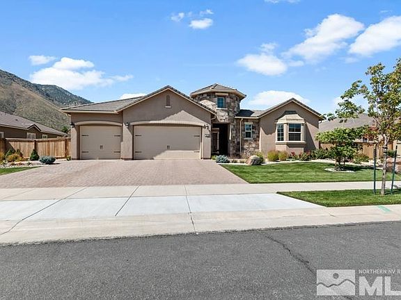 Stunning views of the Sierra Nevada Mountain Range and Duane Bliss Peak! Beautifully upgraded home is located in a "Golf Course" Community that includes tennis, a full gym, pool, and a rec room. Enjoy a lovely evening in your private front courtyard with a gas log fireplace. This is a perfect home for entertaining with an incredible kitchen that opens into a spacious family room with views galore. A Butler's Pantry provides access to a Formal Dinning Room., Large Master Suite with a single French door to the backyard deck. Separate office has double doors. Beautiful backyard with a paver patio and a newly stained deck which is plumbed for a gas bar-be-que. Nice lawn area, mature trees and bushes and a dry creek river bed. Custom built 10'-12' storage shed with electricity. (3) Zones for A/C and Heat. Newer LG Washer/Dryer will remain. 3 car garage with epoxy painted floors. (4) black shelves in garage will remain. Ski and ski-poles racks and bike racks will NOT remain.