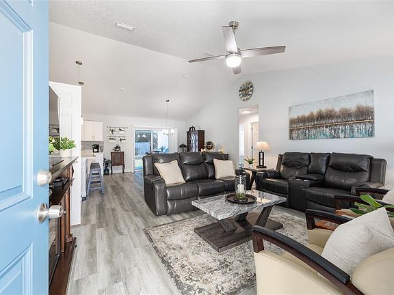 Welcome to this spacious ROSE model offering 4 bedrooms, 2 baths, and an abundance of thoughtfully designed storage throughout. The open concept Living, Dining, and Kitchen areas feature vaulted ceilings that create an airy, inviting atmosphere. Luxury Vinyl Plank flooring flows seamlessly through the entire home, complemented by upgraded 5¼-inch baseboards for a clean, modern finish. The beautifully appointed Kitchen includes wood, soft-close cabinets and drawers with stainless steel pulls, quartz countertops, a tile backsplash, under-cabinet lighting, and stainless-steel appliances. Recessed lighting, pendant fixtures over the island, and ceiling fans with lights in the Living Room and all Bedrooms add both comfort and style. Plantation style shutters will be found in the Primary Bedroom, at the Dining Room Sliding Glass door that accesses the covered Lanai. An interior laundry room provides even more convenience with a dedicated storage closet and shelving. Two of the remaining three bedrooms include walk-in closets, giving everyone plenty of space to stay organized. The home is also equipped with an ADT security system for added peace of mind. Situated on a homesite with room for a pool, the property offers excellent potential for outdoor living. Fences are allowed, making it easy to create privacy and a secure space for children or pets.