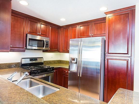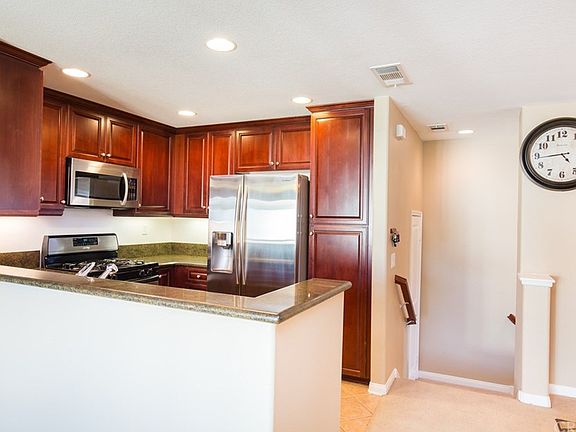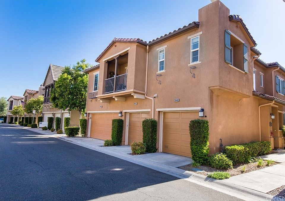 2 bedroom 2 bath, 1121 sq. ft. end unit located in the Mariposa Tract at Plum Canyon. This turnkey unit features a great open floor plan with a dining room, and open kitchen with granite counter tops, tile floors,stainless steel appliances, and plenty of storage. The kitchen is open to both the living room and the dining room, and there is a sliding glass door off the living room that leads to a patio/balcony that is perfect for relaxing or using your BBQ. There are 2 good sized bedrooms and baths including the master suite with 4 mirrored wardrobe doors worth of closet storage space, a master bathroom with dual vanities and standing shower enclosure. Downstairs at the entry is a direct access 1 car garage with a laundry area with hookups for a full size washer and dryer. Other features include ceiling fans, recessed lights, carpeted living areas and bedrooms, ceiling fans, and neutral paint colors to make you feel right at home. The community boasts some very nice amenities including a playground for the kids, a community pool/recreation area with a banquet room, pool, spa, and room to spend the day poolside with family and friends. Located minutes from eateries, retail outlets, and freeway close for commuters, this unit has what you're looking for. The HOA also has some of the lowest fees in the entire SCV.