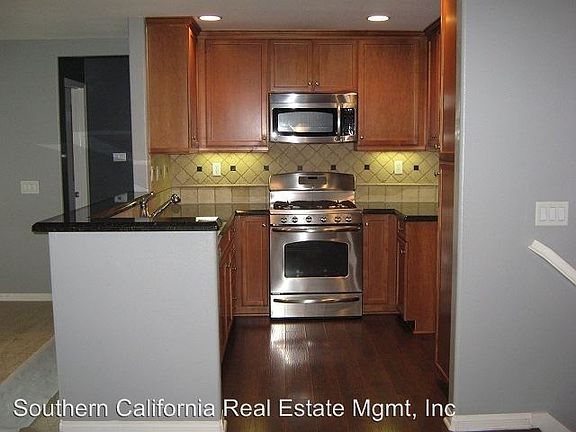 Two Bedroom Upper Townhouse in Saugus - Nicely upgraded upper two bedroom condo in Saugus. A landscaped walkway leads you to the entryway with a door to the attached one car garage and interior staircase to the main level. The living room has a ceiling fan and a sliding glass door leading to the balcony. The dining area has wood laminate flooring and plantation shutters. The kitchen has been beautifully upgraded with granite counter tops and designer tile backsplash, maple cabinetry, wood laminate flooring, recessed lighting and stainless steel appliances. Kitchen appliances include: stove, dishwasher and microwave. The guest bedroom has plantation shutters and a ceiling fan. Full guest bathroom. The master bedroom has plantation shutters, a ceiling fan and two closets. The attached full master bathroom has double sinks. Enjoy the HOA pool, spa and playground.