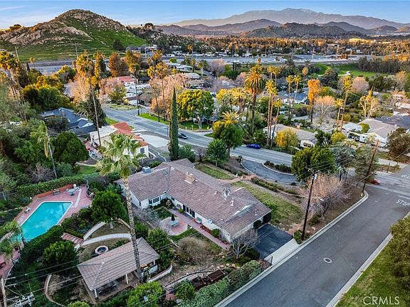 This inviting single story pool home in the enclave of Rockledge Park, known for interesting architecture, terraced gardens and views of mountains and city lights offers all of the gracious living for which this community is known. Built in the mid-century ranch style the home blends beautifully with its surrounds providing indoor and outdoor spaces for relaxing and entertaining. The front room has a fireplace and large windows providing views of the San Gabriel mountains, Mount Rubidoux and the city lights of downtown Riverside. There are four spacious bedrooms including two master bedrooms, perfect for multi-generation living, as they are at opposite ends of the house. A tastefully updated kitchen with quartz counter tops, custom backsplash, stainless steel appliances including two ovens and a microwave/convection oven, gas cooktop, a breakfast nook and walk-in pantry. Perfect for entertaining is the family room, which is large enough for seating, a game table, and has dual wood framed sliders that open to the backyard patio. The lovely grounds include meandering paths through the gardens, mature trees including citrus trees, terraced planters, and a serene fountain. The yard also includes a cabana with a barbecue and plenty of counter space for food prep and or bar service. The elevated pool area with mountain and city views is just steps away. Additionally, this home offers a two car garage with storage space, recently updated two stage heating and cooling with separate controls for the primary master suite, a circular driveway, and a completely fenced yard. It is centrally located between Riverside Plaza and Downtown Riverside, and just a few blocks from the Victoria Club providing easy access to restaurants, walking trails, entertainment and freeways.