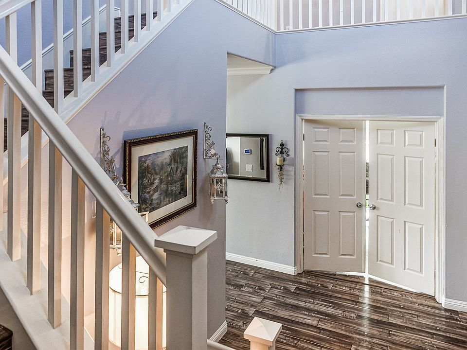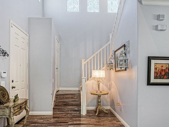 This beautiful Pool Home features a formal foyer, beautiful laminate wood flooring throughout the first and second floor, and dramatic laminate wood stairs leading to the second floor. Home features 3 bedrooms plus a Den Downstairs which could potentially be used as a 4th bedroom. Crown molding throughout. Great Room with gas burning fireplace and media niche. Beautiful kitchen with large island, recessed lighting, walk-in pantry and granite counters is open to the dining room and the great room. Adorable powder room downstairs has wainscoting and a pedestal sink. Master bedroom suite has vaulted ceiling, ceiling fan, decorator paint, and fantastic views from the windows. Remodeled Master bathroom has a large soaking tub, separate shower, two vanities with upgraded modern glass sinks, and a walk-in closet. Laundry room with storage cabinet and large secondary bedrooms are also located upstairs. Rear yard features a lovely pool and landscaping. There is a built-in BBQ area, just needs a new BBQ. Beautiful hardscape and pavers around the pool and patio area as well as grassy area for pets and children to play. Home is ideally located close to schools, shopping and transportation.