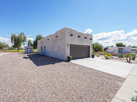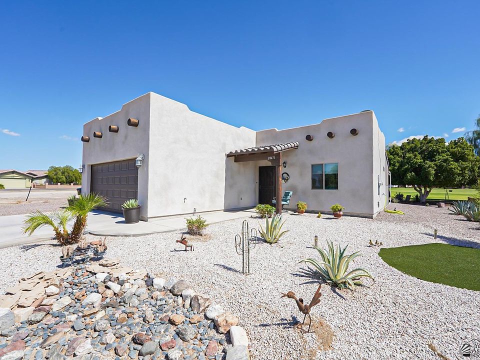 FOR SALE | $288,000 Built in 2020, this 2 bed, 2 bath home offers 914 sq. ft. of comfort with an open floorplan and golf course lot views. The living room a ceiling fan, while the dining area shines with a chandelier. The kitchen is beautifully finished with granite countertops, pantry, and included appliances: refrigerator, dishwasher, electric range/oven, and garbage disposal. The primary bedroom offers tile flooring and a walk-in closet. Additional perks include dual-pane windows, central heating & cooling, covered patio, RV access, easy-care desert landscaping, and an attached 2-car garage with openers. Conveying with the home: washer, dryer, and storage shed. Pets are welcome, making this home as practical as it is charming! Don’t miss your chance to own a move-in ready home on the golf course.