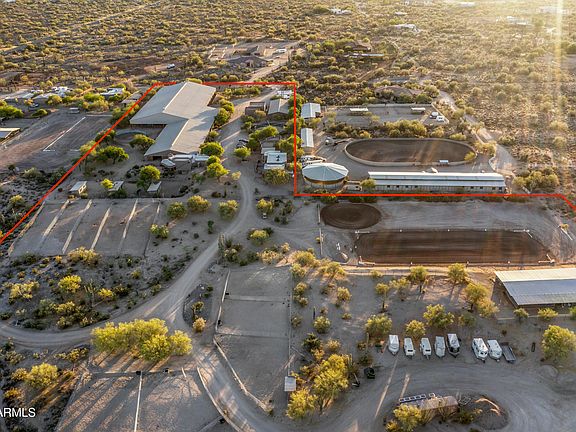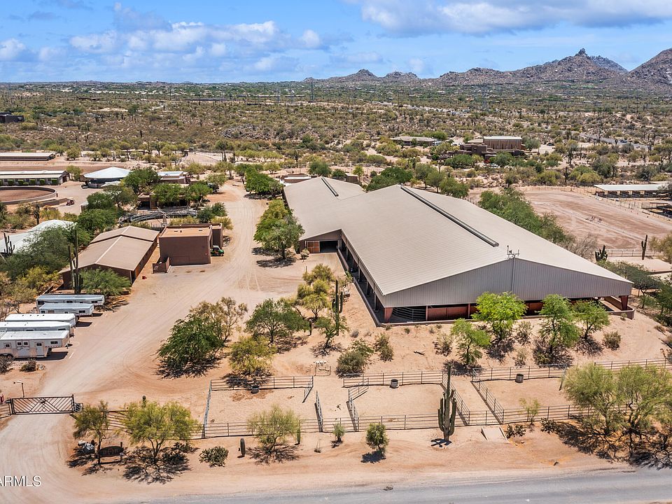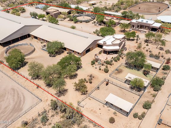 Set on 15 acres, this premier equestrian training and boarding facility has been thoughtfully updated to meet the highest standards. Highlights include a 34-stall main barn with an expansive 120x240 attached covered arena, a 13-stall junior barn, a 16-stall mare motel, and 3 custom horse casitas. The property also features a 150x300 outdoor arena, 15 turnouts, a round pen, 6-horse hot walker, air-conditioned lounge, vet lab, and multiple tack rooms. Accommodations include a luxurious, redesigned 2-bed/2.5-bath guest house with custom Italian finishes, a barn office/guest house with a backyard & rooftop deck, and a staff duplex with two 2-bed/1-bath units. Easy access to trails & stunning views of Pinnacle Peak, this property offers both exceptional facilities and a prime location.