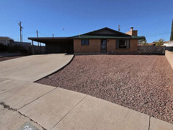 Beautifully updated 4 bed, 2 bath brick home on a corner lot with a spacious backyard and alley-access parking large enough for a 38' camper or boat. Upgrades include a 3-year-old metal roof, fresh paint, new carpet, new tile in the bathrooms, new ceiling fans and new vinyl flooring in the dining room. The inviting living room features a cozy fireplace, also offers forced-air natural gas heat, central A/C, and a swamp cooler setup. The backyard provides green lawn space, clumping bamboo for privacy, 3 trees and two insulated, powered sheds—one previously used as a wood shop and the other set up for dogs with a dog door and dedicated run. A two-car carport with a large storage compartment adds extra convenience. This move-in-ready home offers comfort, versatility with a excellent location.