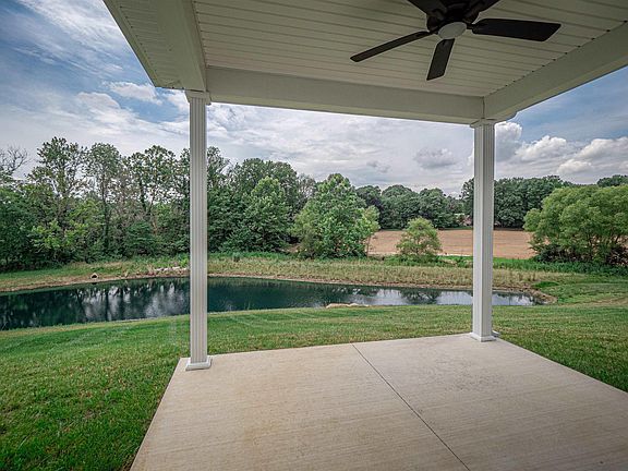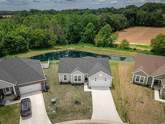 Welcome to this stunning one-story home featuring a desirable split bedroom design and an open concept floor plan. Bathed in natural light from large windows, the living space is warm and inviting. The beautiful kitchen boasts ceiling-height cabinets, stainless steel appliances, quartz countertops, and a raised breakfast bar—perfect for entertaining. The owner’s suite is a true retreat with a custom-tiled shower, oversized vanity, and a spacious walk-in closet. Step outside to the covered patio and enjoy breathtaking views of the lake and picturesque west side farmland. At just two years old, this home is move-in ready with sparkling clean RevWood floors throughout the living areas. Nestled in the peaceful surroundings of Evansville's west side, this better-than-new Jagoe home offers both comfort and serenity. Many upgrades completed in this Zircon Farmhouse floorplan!