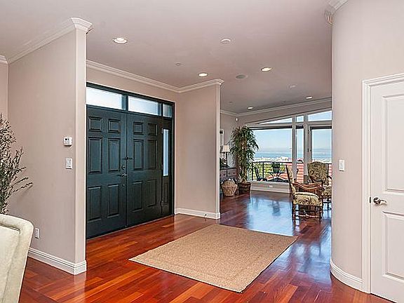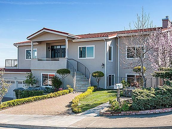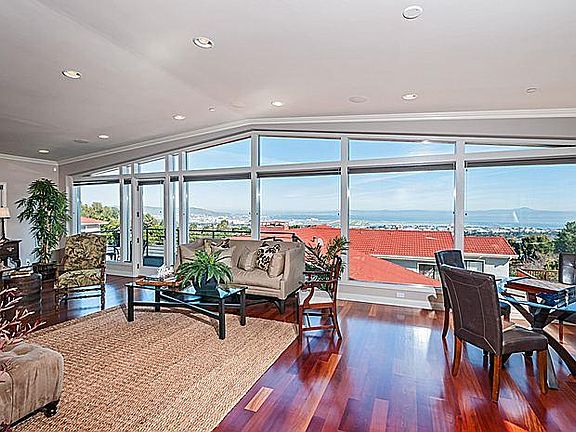 Fantastic view of SF Bay and Airport from living room and Master Bed, 1300 sq ft of decks off Liv. rm and Master suite. Dramatic 9 - 10.5 ft ceilings throughout with 6" crown molding and 5" baseboards w/custom heated Brazilian cherry floors. Gourmet kitchen w/granite counters and 4 X 7 ft island and cherry wood cabinets. Spacious formal dining room. Dramatic circular stairway leads to lower level w/ approx. 1165 sq ft with 2 bedrooms, large study and large full bath.