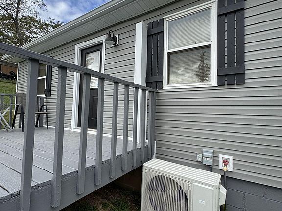 Gorgeous fall foliageFront deckReclaimed barn-wood flooringStep-in showerRainbow poplar countertopsKitchen appliancesNew vinyl siding