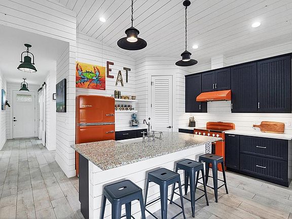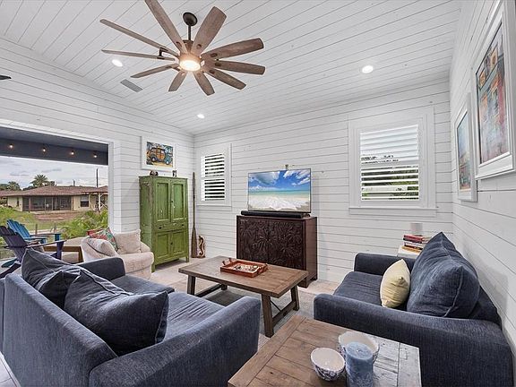 Fenced yardScreened lanaiVetrazzo recycled glass islandOversized epoxy-finished two-car garageBright open living spaceVaulted ceilingsWrapped in shiplap