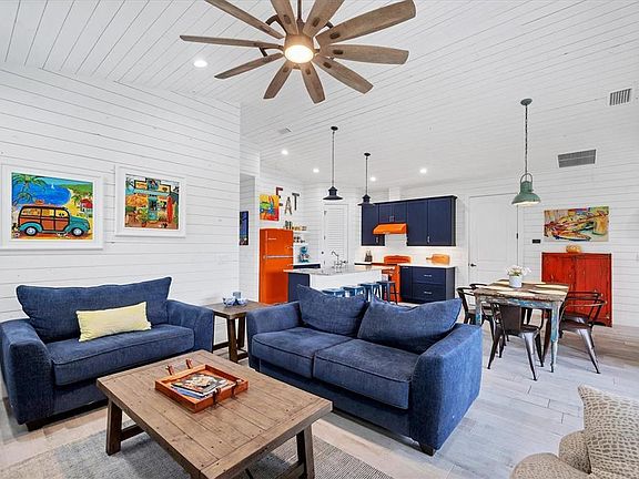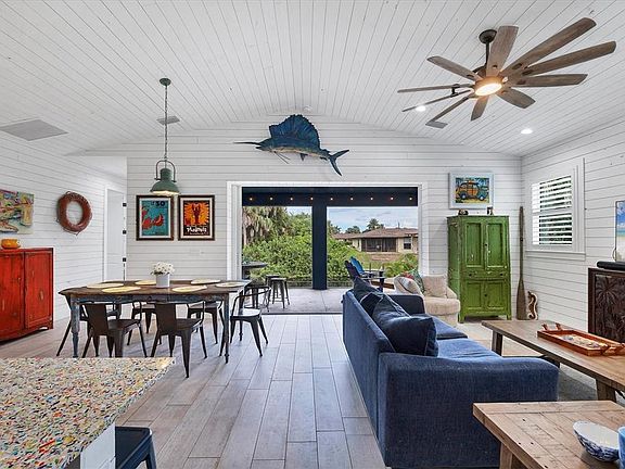 Fall in love with this fully furnished 3-bedroom, 2-bath custom home with an office, a one-of-a-kind Key West-inspired retreat perfectly positioned along the peaceful canals of Palm Shores with direct sailboat access. Built in 2023, this home was crafted with creativity, heart, and attention to detail. There is truly nothing else like it. From the moment you arrive, the vibrant blue exterior and sunshine yellow door set the tone for what awaits inside. Step into a bright, open living space wrapped in shiplap, filled with natural light, and framed by vaulted ceilings that give the home an airy coastal feel. Pocket sliding doors create a seamless connection between indoors and out, opening to a screened lanai and spacious patio surrounded by tropical landscaping, perfect for gatherings or quiet mornings by the water. At the heart of the home is a retro-inspired chef’s kitchen featuring Big Chill appliances, a Vetrazzo recycled glass island, and a Fireclay farmhouse sink, a colorful statement that blends vintage charm with modern luxury. High-end finishes and thoughtful features are found throughout, including plantation shutters, impact-resistant windows, and an oversized epoxy-finished two-car garage with a 220V outlet, ideal for charging boats, storing items, or serving as a workshop. Built to modern codes with an impressive 11-foot elevation and hurricane-impact windows and doors, this home offers peace of mind, energy efficiency, and lower insurance costs while maintaining beautiful water views. The fenced yard adds privacy and charm, and with no HOA or rental restrictions, this home offers endless possibilities as a full-time residence, seasonal getaway, or ready-to-go short-term rental. Just seconds of boating from your canal, and you are in the open waters of Peace River leading straight to Charlotte Harbor and the Gulf beyond. The boat dock permit has been approved, and installation is scheduled to begin. Located minutes from downtown Punta Gorda, I-75, and the Gulf’s pristine beaches, this home captures the magic of true Florida living, vibrant, breezy, and completely one of a kind. Schedule your private tour today; all you need to bring is your suitcase, because this home is complete and ready to enjoy.