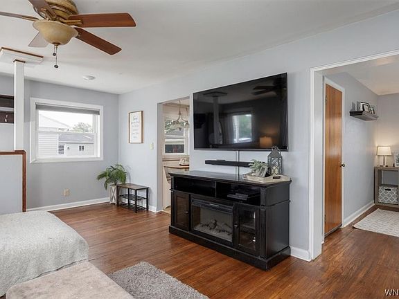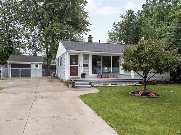 Pride of ownership shows in this move-in ready, light & airy, beautifully-maintained 3 bedroom, 1 bath "story book" ranch in desirable Green Acres, Tonawanda! Prime location - quiet street, yet close to all conveniences of N.F. Blvd! The flexible floor plan features a removable bookcase wall that converts the third bedroom into additional living space if desired. Many updates! Central A/C added to high-efficiency furnace (2017). NEW: concrete driveway, trex front porch, sump pump & H/W tank (2018). Refinished hardwood floors (2016) and fresh neutral paint throughout (2020). 1.5 car detached garage has new electrical (2022). Updated eat-in kitchen w/ granite counters & adjoining mudroom. Matching kitchen appliances, washer & dryer included. Garage refrigerator & basement chest freezer negotiable. Enjoy your private, fully-fenced backyard from the new deck (2021)! Maintenance-free vinyl siding. Spacious, dry basement w/ high ceilings - could be easily finished as rec/play area and offers tons of storage! Even more storage in backyard shed (included)! Showings begin immediately. Open house Saturday, July 8th, 11:00 AM - 1:00 PM. Offers, if any, are due Wednesday, July 12th at 6:00 PM.