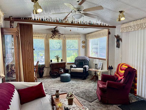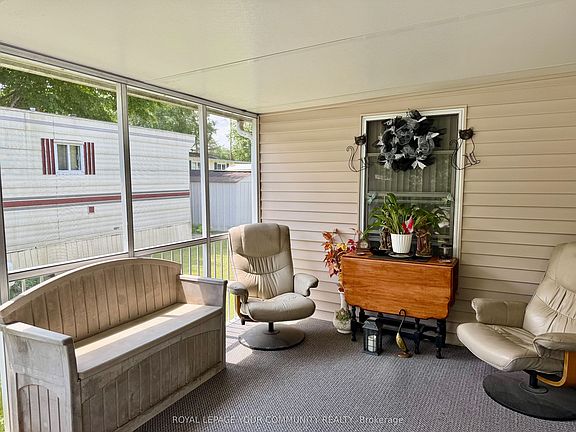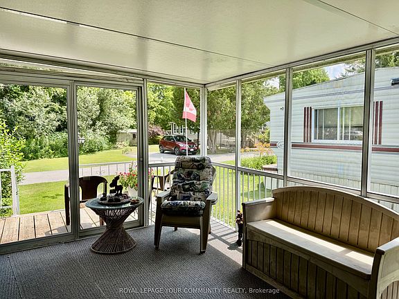Lovely 4 season, well maintained home, situated in popular Lyndhurst golf and park! Cozy 1 bedroom home, with private, covered and screened in porch, and well sized back yard with 3 storage sheds. Approximately 10 minutes from Lake Simcoe, and just under 15 minutes to the highway 404 extension! Open concept home, one bedroom, 4 piece bathroom with nice sized vanity and a 3 season sunroom with walkout to backyard! Below home insulated 2020, roof 2020, Hot water tank 2023, furnace serviced every year. Enjoy walking trails, an inground pool, and just steps from a beautiful 18 hole golf course! This home is located on leased land. 12 Month lease in place, monthly lease is $478.68 + HST
