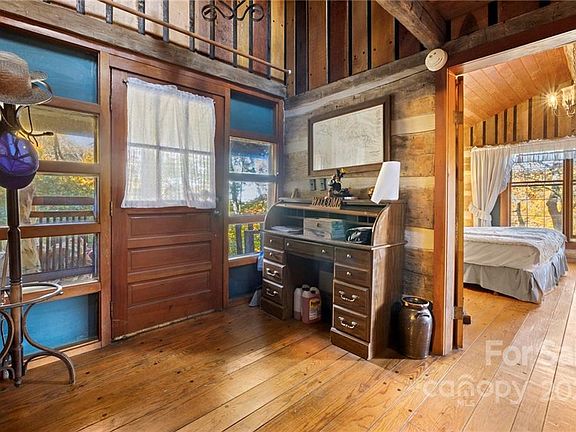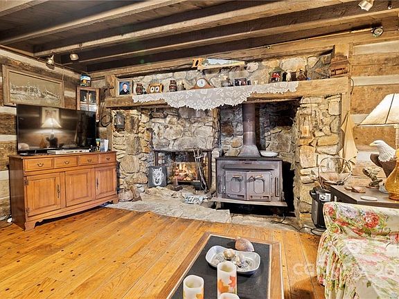 Quintessential log cabin in beautiful Wolf Laurel! Well-kept vacation home made of beautiful chestnut logs. Offered fully furnished, and ready to use! With multiple beds spread through two bedrooms, plus a big cozy fireplace in the living room, there is enough space for everyone! Enjoy your summers in the clean North Carolina air as you enjoy the deck, steps from your downstairs kitchen equipped with a true wood burning stove as well as the modern options, alongside a family-sized hardwood dining table. The large deck is equipped with a bbq and seating to enjoy the beautiful vistas from the home, while the upstairs offers a traditional porch swing and rocking chair-style porch that open right up to the gorgeous view. Enjoy a large sized lot that backs up to Wolf Laurel green space. Gated community, with many restaurants open May-Oct, and then again for the ski season! This well-loved family vacation home is looking for its new owners! Now winterized and available for as is sale.