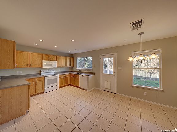 This pleasant, spacious home in the Boerne Heights subdivision offers the perfect blend of comfort, style, and convenience with 5 bedrooms and 2,670 square feet! As you step into the foyer, you're met with soft, warm tones that create a welcoming ambiance throughout. The interior of the home has just been painted and is ready for you to enjoy. The comfortable living room with striking wood-burning fireplace is open to the kitchen area, and perfect for entertaining and for family get-togethers. The formal dining room is ideal for hosting gatherings, while the cozy breakfast nook offers a casual space to enjoy morning coffee. One handy guest bedroom with bath is on the main floor and the four additional bedrooms are on the second floor, with two more full baths. The primary bedroom and bath are spacious and the primary closet includes a closet system. Additionally, at the front of the home you'll find a separate office, just right for working from home. For those who love natural light, the many windows of the home seamlessly connect indoor and outdoor living. The backyard with patio is fully fenced and would make a wonderful area for your garden. A large band of trees runs outside of the fence providing a feel of nature. Top-rated schools, dining, and shopping are nearby.
