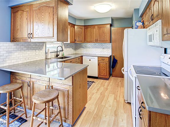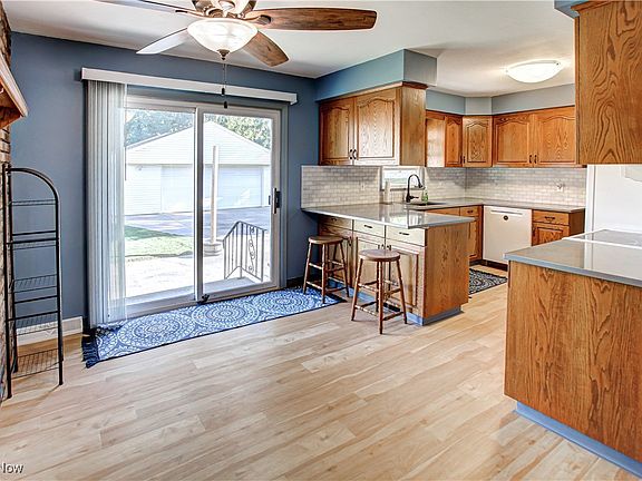 If you're looking for one-floor living, then look no further than this well-maintained 3 bedroom & 2 full bath Ranch. It offers an open floor plan with 1,120 sq ft of above-ground living space plus a partially finished basement. Once inside, you step into the bright living room filled with a ton of natural light. Notice the lovely hardwood floors throughout the living room, hallway, and all 3 bedrooms. The large eat-in kitchen is off the living room and was completely updated in July 2023. It features oak cabinets, ceramic tile backsplash, quartz countertops, a breakfast bar, VLT flooring and all appliances are included. The brick accent wall in the eat-in area adds character and charm to this space. Enjoy views of the backyard through a sliding glass door in the eat-in area that leads to the patio in the backyard. Down the hall, you will find 3 nice-sized bedrooms all with ample closet space and a full bath. The basement provides additional living space. There is a large recreation room, a 4th bedroom or office, and a beautiful remodeled full bath with a walk-in shower. In addition, there is a storage room and a laundry room. Other notable features: an updated electrical panel in May 2024, basement waterproofing in Nov. 2023, vinyl replacement windows throughout, a large backyard, an oversized 2-car detached garage. This home is move-in ready and just waiting for new owners!