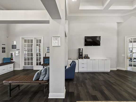 - Exterior features: 42-inch custom upgraded cabinetry, Attached and detached garages, Barbecue, Bicycle storage, Business Center, Electronic parcel locker system, Fenced paw park, Garden, Nine-foot ceilings with double crown molding, Pet grooming station, Resident coffee bar, Spacious floor plan design, Tot lot play area