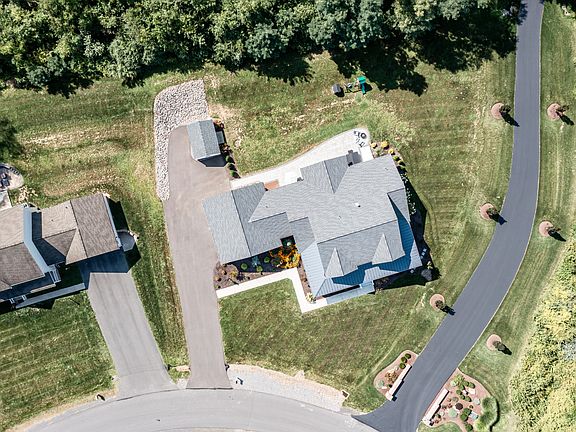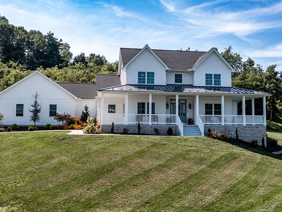 This stunning 2021 farmhouse-style home features 5 bedrooms, 4 baths, and a 9-ft ceiling open floor plan. The Great room, kitchen, and dining area are adorned with a stone gas fireplace and white oak beams. The kitchen boasts roll-out shelves, soft-close cabinetry, subway tile, and a white oak island with Quartz countertops. The first floor includes an owner's suite with an en-suite, tiled shower, Quartz countertop, and a spacious walk-in closet. Additionally, there's an office, a bedroom, a full bath, and laundry on the first floor. The second floor offers two roomy bedrooms, ample closet space, a full bath, and a 5th bedroom or play space. The .6-acre lot includes a storage shed and a fully landscaped yard, creating a picturesque setting for this exquisite home.