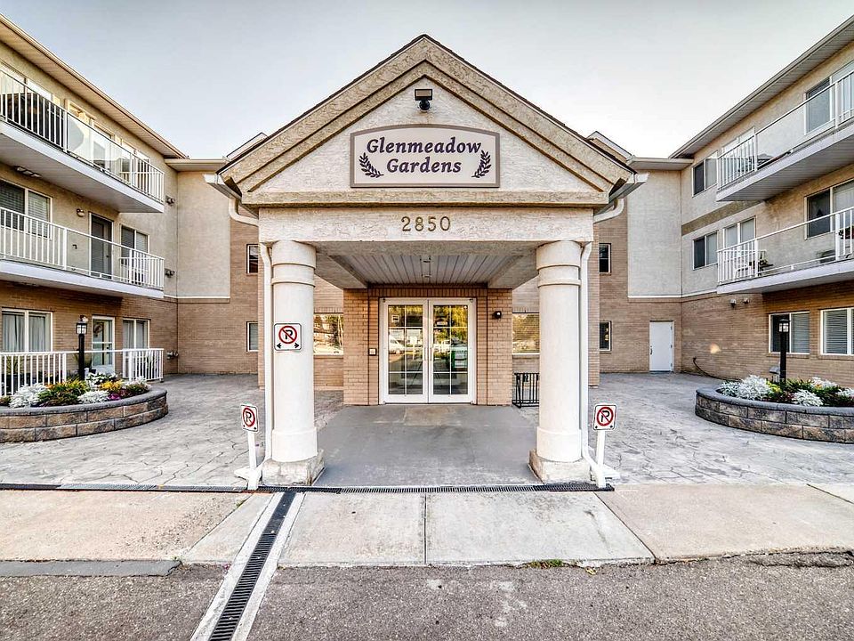 Welcome to sought-after Glenmeadow Gardens, a friendly 55+ community with wonderful amenities. This bright & well maintained 960 sq ft main floor unit offers a 2 bedrooms ( 2nd bedroom ideal for den/home office), 2 bathrooms & in-suite laundry. The open layout features fresh paint throughout, cozy corner fireplace, air conditioning & in-floor heat for year-round comfort. Enjoy your morning coffee on your private balcony with a gate leading to the green space & flower gardens allowing you to continue gardening. You'll also appreciate the assigned heated underground parking stall (if needed), bike storage & large storage room with shelving. Glenmeadow Gardens is known for its welcoming atmosphere & outstanding amenities: a beautifully landscaped courtyard with gazebo, community garden, social room with kitchen, pool table & shuffleboard, fitness equipment, library/card/puzzle area, Telus fiber optics throughout, visitor parking & 2 rentable guest suites for visiting family or friends. This is more than a home-it's a lifestyle of ease, comfort & community in a prime location.
