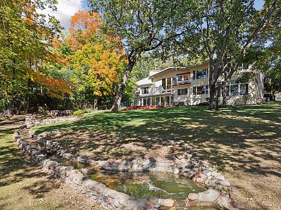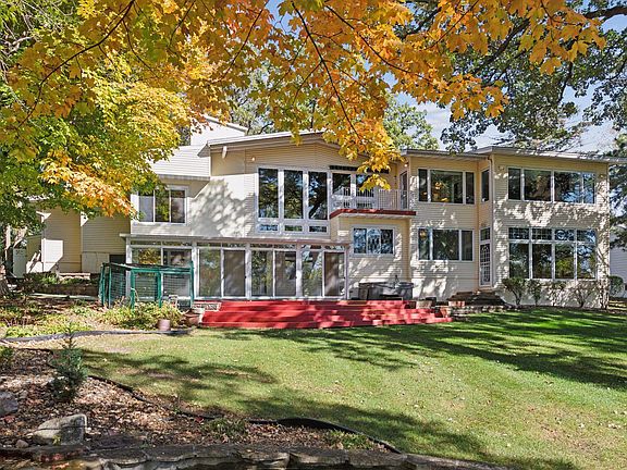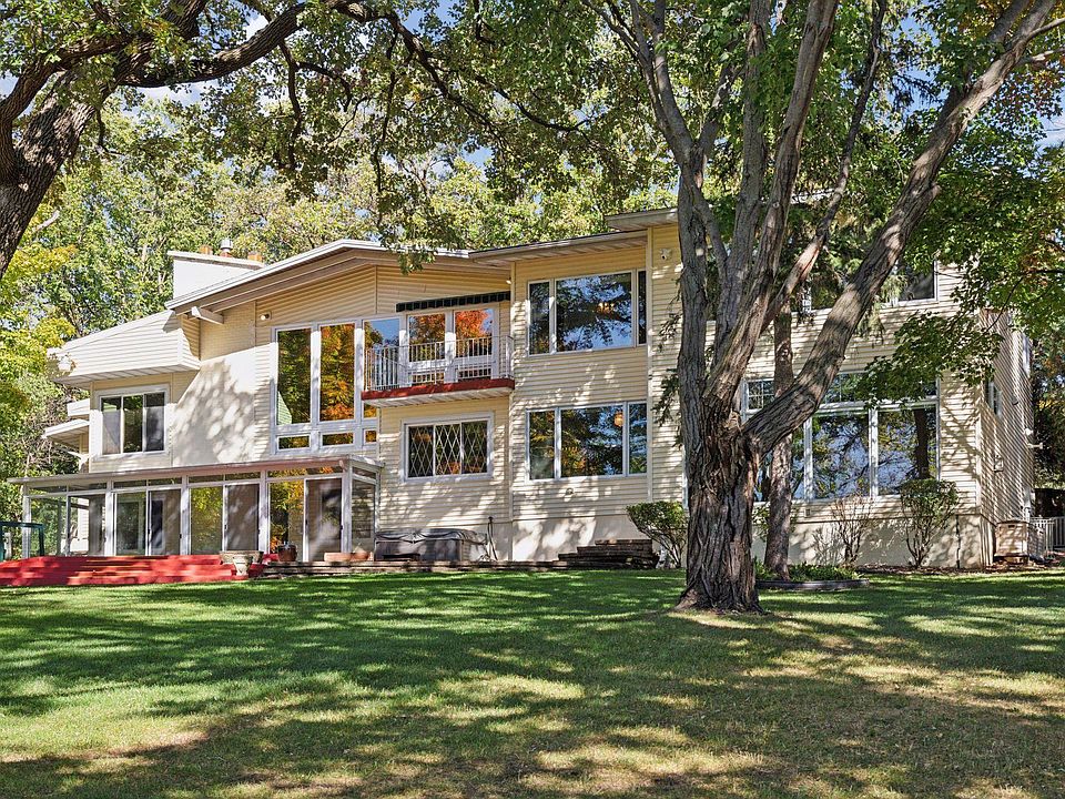 west-facing view of Lake Cobblecrest, just imagine observing the gorgeous sunsets through vast windows in nearly every room. This home was built next to the 1912 estate owned by Leslie H. Fawkes, which still stands today. Immediately upon entering, you'll be greeted by mid-century modern charm with vaulted ceilings, wood beams, expansive windows, and a fireplace that'll blow your mind. Formal dining, informal dining, an open kitchen, and a substantive family room fulfills an entertainer's fantasies. Four bedrooms are all lake-facing. The primary bedroom is something out of your dreams, with a wall of glass facing the lake, a walk-out, vaulted ceilings, a gas fireplace, a walk-in closet, and an ensuite with a jetted tub and separate shower. Additional features include a balcony off the kitchen perfect for savoring your morning coffee, a three-season porch to relish the outside (without the bugs!), a large deck to enjoy