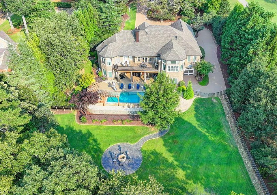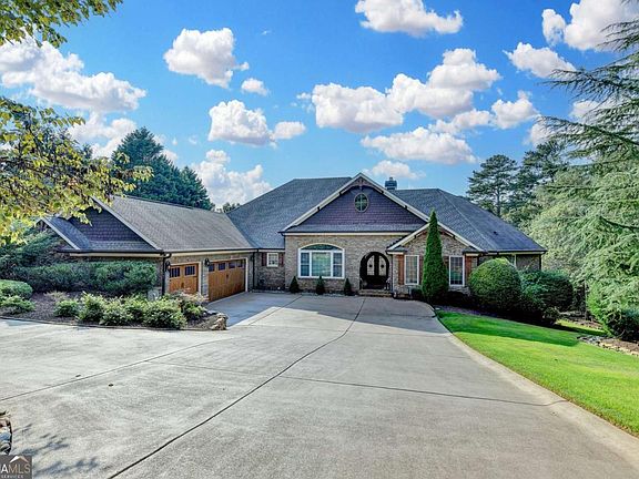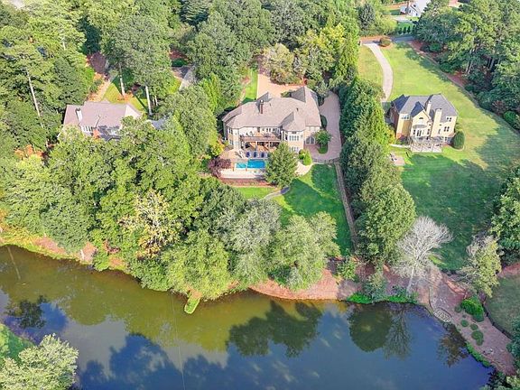 Rare four-sided brick, custom-built ranch situated on 2.38 acres and backing up to a private lake. This exceptional home offers a resort-style outdoor living experience, featuring a rectangular saltwater pool with a built-in Badujet Super-Sport II swim jet system, a tanning ledge and slide, a large stone fireplace beneath a pergola-covered sitting area, and a backyard fire pit perfect for stargazing and enjoying the peaceful lake views. (Property extends to the opposite side of the lake.) Additional exterior highlights include a four-car garage configuration, a three-car garage, a two-car pull-through, plus an additional rear garage for extra storage or workshop space. Step through the double front doors into a welcoming foyer, flanked by a spacious dining room on the left and a large executive office on the right. Toward the back of the home, you'll find one of two full kitchens this property offers. The gourmet kitchen features 2023 Viking appliances, a wall oven with convection oven/microwave, warming drawer, five-burner cooktop, faux-brick backsplash, large breakfast bar with seating for four, granite countertops, tile flooring, two sinks, a center island, and a walk-in pantry. The large family room impresses with soaring cathedral ceilings, a bay window, oversized ceiling fan, and custom built-ins. The owner's suite on the main level includes private deck access and a custom walk-in closet with its own laundry area. The spa-like primary bathroom features a jetted tub and a spacious walk-in shower. The terrace level offers ten-foot ceilings and eight-foot doors, creating an open and luxurious feel. This level includes a full second kitchen with a breakfast bar, stainless steel appliances, and a walk-in pantry. You'll also find an exercise room, media room, sauna, and two additional bedrooms with 1.5 baths. Step outside from the terrace level to a covered porch, perfect for grilling, entertaining, and enjoying views of the pool and lake. Properties like this rarely come on the market, and when they do, they move fast.
