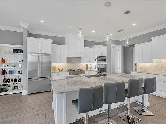 Welcome to this breathtaking custom-built estate in the exclusive Saddle Ridge gated community, offering nearly nine acres of privacy and luxury living. Designed for both elegance and comfort, this 5-bedroom, 3-bath home combines stunning architectural details with resort-style amenities. Step into the grand entry and be captivated by the 14-foot coffered ceilings in the great room, filling the space with natural light and sophistication. The heart of the home is the chef’s kitchen, complete with a 10x5 island, gas appliances, custom cabinetry, and double ovens—perfect for entertaining and family gatherings. The primary suite is a private retreat, featuring two his-and-her walk-in closets with custom built-ins. The spa-like primary bathroom offers a stand-alone soaking tub and an oversized walk-in shower with dual shower heads. An additional en-suite bedroom also includes a custom walk-in closet, making it ideal for guests or multi-generational living. Upstairs, the spacious bonus room provides endless possibilities—whether you envision a home theater, playroom, or additional bedroom. Outdoor living is elevated with a fully screened lanai featuring a custom outdoor kitchen with gas grill, perfect for alfresco dining. The resort-style pool and spa include a rock waterfall, waterslide, and hot tub, creating the ultimate entertainment space for family and friends. Additional highlights include a 3-car garage, expansive acreage for privacy and recreation, and all the perks of living in a secure gated community. Every detail of this estate was designed to inspire—combining luxury, function, and unforgettable spaces inside and out. This isn’t just a home, it’s the lifestyle you’ve been dreaming of.