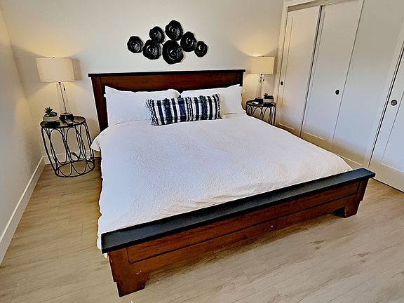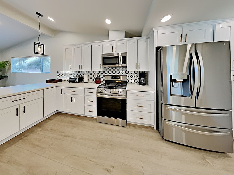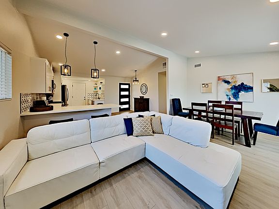 Fully Furnished Completely Remodeled 4 Bedroom 2 bath home with Garage in North West Clairemont. New Kitchen, appliances, baths, and extra wide vinyl plank flooring throughout. Canyon views extend from the north east to Soledad Mountain to the west from the large, peaceful, fenced yard with partially covered Patio on this 12,500 sq ft lot. Open Concept Kitchen, Living room and dining area with sliding door opening up to the outdoors. Fenced front yard area makes a great space for families playing and relaxing together. The 4 Bedrooms are furnished with 1 King, 2 Queen, and a single bed with pull out trundle bed, sleeps 8 in real beds and up to 9 total guests with provided air mattress. Some Pets are considered, with additional pet fee, please inquire first. Cats not allowed.
