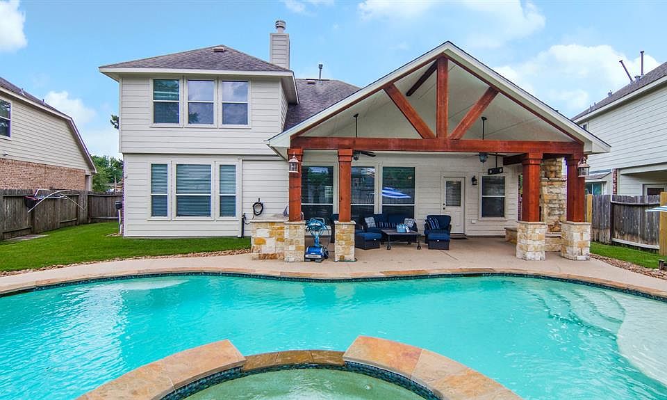 Create lasting memories in this beautiful 2-story home in Spring Trails. Property HAS NEVER FLOODED. This 4-bedroom, 2.5-bathroom home boasts well-manicured landscaping, updated irrigation system, high ceilings, a wood burning fireplace, game room with built-ins, and 3-car garage. Create chef-inspired cuisines in the kitchen equipped with granite countertops, espresso cabinetry, gas range, and a breakfast bar. The master suite is the ultimate retreat with a walk-in closet, dual vanities, garden tub, and separate shower. Entertain family and friends in the gorgeous backyard with a covered patio, outdoor kitchen & fireplace, sparkling pool, and spa. Ideal for commuters with easy access to major roadways, including the Hardy Toll Road, I-45, and the Grand Parkway. Just 10 miles from premier shopping, dining, and entertainment in the Woodlands. Schools are zoned to Conroe Independent School District. Schedule your private showing today!