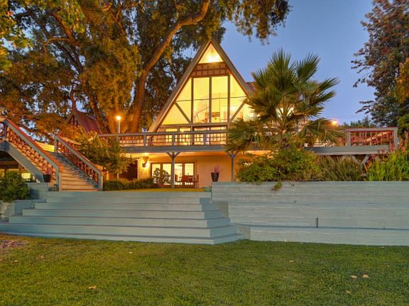 Nestled on a serene riverfront parcel, the "River Chalet" at 2851 Garden Highway offers the best of waterfront living -- expansive views, timeless craftsmanship, and effortless proximity to both downtown Sacramento and the airport. Designed across four levels, this 3-bedroom, 3-bath residence is anchored by a dramatic spiral staircase rising through the center of the home. The main floor dazzles with soaring cathedral ceilings, floor-to-ceiling windows overlooking the river, warm Tigerwood floors throughout, and a gourmet kitchen with horizontal cherry cabinetry, granite counters, high-end appliances, and a breakfast nook with a view. Below, a private apartment creates an ideal guest or in-law retreat. Above, the primary suite indulges with a spa-like bath featuring Blue Azul stone, heated floors, glass sinks, and a Neptune soaking tub with sweeping water views. At the top, a walk-in closet and light-filled retreat with striking triangular window offer flexible space for yoga, creative work, or reflection. Outdoors, a massive wrap-around deck embraces a centuries-old oak, evoking a magical treehouse feel. At the water's edge, a private dock with covered boat lift awaits. An adjacent lot is also available, adding even more opportunity along this coveted stretch of riverfront.