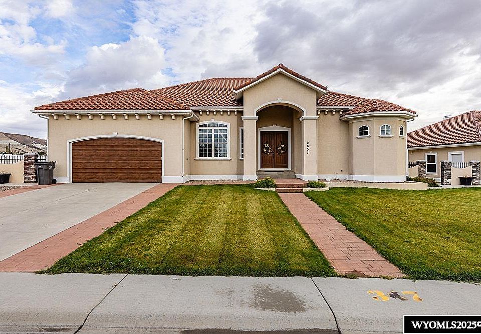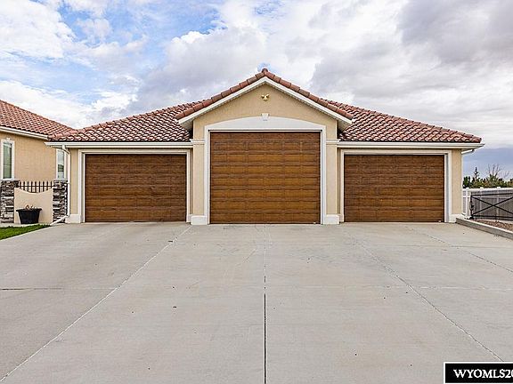 WELCOME HOME TO 2851 MUSTANG DRIVE! Sitting in the desirable neighborhood of Sweetwater Station, this impressively built residence offers both luxury and tranquility within the city limits, along with beautiful mountain views! The main level of this 4385 sq. ft. ranch style home offers all of the upgrades including vaulted & trayed ceilings, tile & oak flooring, brand new carpeting, crown moldings, and solid knotty alder interior doors. The chef's kitchen features granite slab countertops, knotty alder cabinetry, double ovens & coordinating stainless steel appliances. Retreat to the luxurious master suite featuring a huge walk-in closet, & spa-like ensuite with jetted tub, double sinks, and a walk-in glass & tile shower with dual shower heads. Two additional bedrooms and the main full bath complete this level. The fully finished basement offers a large family room complete with wet bar, a beautiful stone accent arch, pellet stove to keep you cozy on cold winter nights, plus a theatre room perfect for entertaining, 3 additional bedrooms, full bath, a play room, & additional rooms for whatever you choose (in-home office- work out room). There is an attached 2 car garage and a 4+ detached heated garage/shop with 1/2 bath (1860 sq. ft.) for all of your vehicles & toys! Extra outdoor features include a completely fenced & gated 39,204 sq. ft. lot, tile roof, extensive concrete RV parking, massive gravel parking areas, stamped & stained concrete accents, & a large covered patio. To make this your dream home call Tami Christensen at 307-389-5530 for your private viewing today!