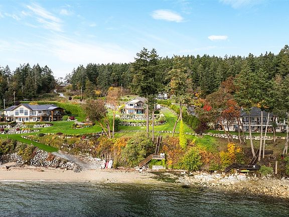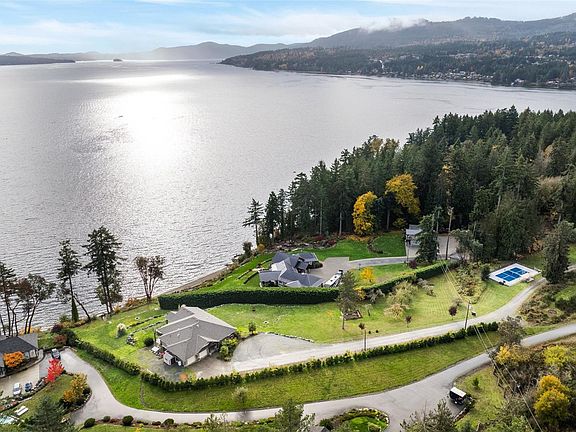 Live a life that unfolds by the water’s edge. Set on 3 acres along the shores of Mill Bay, this rare oceanfront estate blends craftsmanship and West Coast beauty. A welcoming covered entry framed by cedar beams and stone detailing leads to a warm, open-concept interior bathed in natural light. Expansive windows and a large glass-panel deck capture panoramic views across the Inlet—perfect for entertaining or quiet mornings. Thoughtfully designed with guest accommodation, media room, and a private pickleball court, this home balances comfort and recreation. Manicured lawns roll gently to the shoreline, where a deep-water buoy lets you tie up and explore the coast. Enjoy front-row seats to Butchart Gardens fireworks all summer long, and easy access to Mill Bay Marina, Arbutus Ridge Golf Club, award-winning wineries and world-class schools including Brentwood College and Shawnigan Lake School. A rare opportunity to own a true West Coast retreat where craftsmanship meets coastal living.