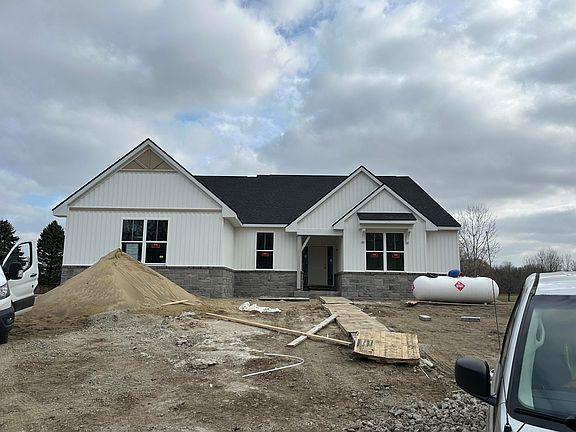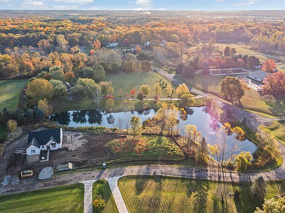Currently under construction with December/January occupancy! Ideal Scenic 2.24 acre parcel offers scenic pond views and Western front elevation. Interior features include a great room that opens to the kitchen and eat-in nook, study, mud room with a walk-in closet, laundry room, primary suite with a private full bath and walk-in closet, and two secondary bedrooms with a jack-and-jill bath and walk-in closets.Everything you need on one level. Cathedral ceilings accent the great room and a cozy fireplace is a perfect spot to finish your favorite book. The great room opens in to the Chef's inspired kitchen with light coming in from all angles and featuring 42' upper cabinetry, quartz countertops, hardwood floors with a large central island. 3 car side entry garage, concrete driveway. SEV and taxes currently set for vacant land.