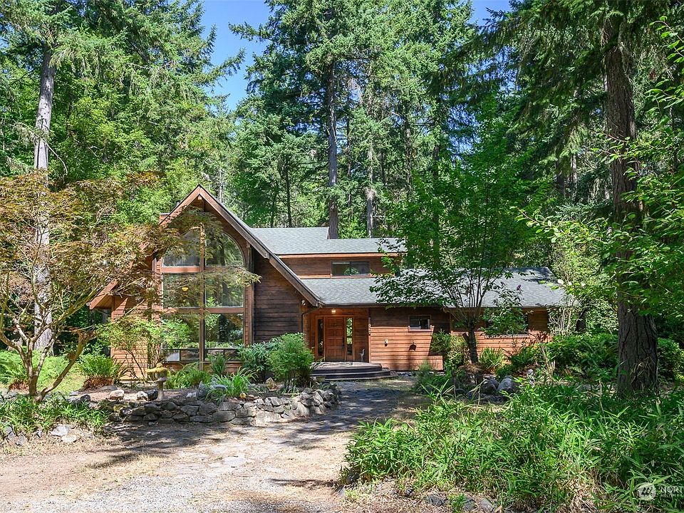 Surrounded by ten acres of field and forest---in totally quiet privacy---this 3 bedroom, 2 bath home in 2,690 sq. ft. is in the middle of 10 acres, all connected by wide trails. High-end finishes include stone, hardwood and ceramic tile floors, CVG fir stairs and trim throughout; large, gracious spaces, and a wall of windows captures light; There are vaulted ceilings on both floors, with two main floor bedrooms and the entire second floor devoted to the primary suite with an adjoining room for office or multi-purpose use. Garage and shop, as well as other useful outbuildings. Designated open space with the potential second home site. Walk in your own woods, garden forever, in this secluded paradise!