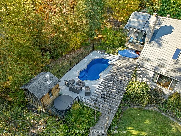 Between Campbellford and Marmora sits a riverside estate. A quiet, peaceful, serene place with a building made of stone, built with care--a much loved home. The main floor is open and bright with a high vaulted ceiling, large windows with views of the river, a wood stove for warmth on crisp autumn days. Open to the living room is a warm cherry wood kitchen with granite counters and stainless steel appliance. It flows to the dining room with a walk out to your saltwater pool and out to the backyard, your retreat. On this floor is also a tiled shower, a study/laundry/room. Upstairs, the master has its own balcony with breath-taking views. Two more bedrooms wait down the hall. The bath is large, with a jetted tub and a shower. The large basement family/bar/games room has a walk up for easy access, a wet-bar, a former fireplace (that could be brought back) and another utility room with tonnes of storage. Outside the land has so much to offer. A heated salt-water pool. A hot tub. A large heated -insulated garage that is perfect for tinkering, building fixing-or storing your toys. There's a greenhouse. A basketball court. A bunkie with root cellar. There are treehouses, a small fenced paddock. The river runs here. Over a hundred feet of riverfront. You can swim, boat and fish. The estate is built for life. Many ways to heat it. A generator backup if the power fails and supplemental wood heat. A built-in water sprinkler for the grass, a gorgeous stone and rock waterfall. Gardens a plenty. This is more than a home. This is a stead. A dream stead.