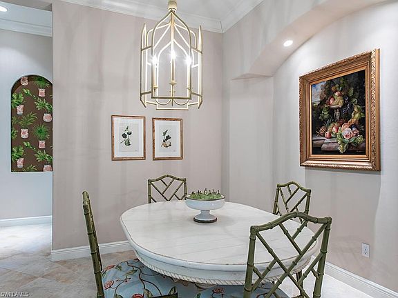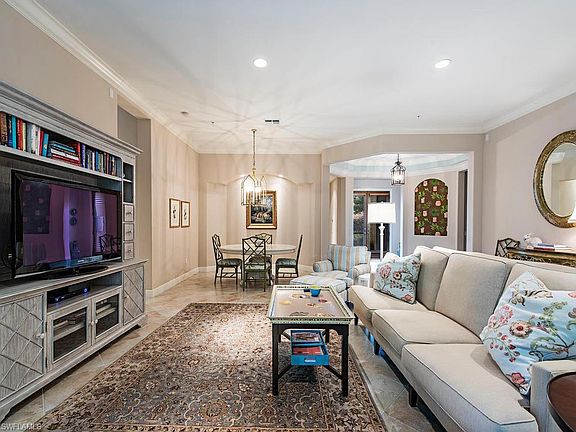 Tranquility flows throughout this first floor coach home in the newest coach home community in Mediterra. Upgrades abound to include fresh paint, newer AC unit, plantation shutters, crown molding and impact windows, all tied together with beautifully neutral decor and finishes. Gorgeous flooring tile laid on the diagonal flows throughout this spacious open floor plan with three full bedrooms plus den and a peaceful screened lanai. Entertaining is a breeze in the gourmet kitchen complete with stainless steel appliances, granite counter tops and delightful stone back splash, overlooking the casual dining area and breakfast bar. Comfortable guest suites boast private full baths, and the intimate den is currently staged as a grandchild suite, providing extended living space right off the spacious great room. The tropical screened lanai extends indoor living outwards into the lush green preserve and professionally manicured lawns. New roof installed in March 2020 & all Calabria buildings are scheduled to be painted. Enjoy luxurious living by the sparkling community pool while enjoying the many amenities offered in the exclusive Mediterra lifestyle.