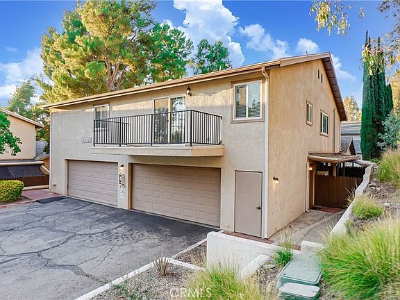 Welcome to this charming Murrieta Villas condominium! With two bedrooms and two bathrooms, this lovely upstairs unit boasts 993 square feet of living space, a private front-facing balcony and an attached garage. The entryway welcomes you at ground level, where a staircase leads to the main living area on the second floor. At the top of the stairs, natural light fills the living room from the sliding glass door to the private balcony, highlighting the combination of carpet and tile flooring and the light, neutral paint scheme throughout. Beyond the living area, the well-appointed kitchen, dining space, bedrooms and bathrooms await. The kitchen offers ample counter and cabinet space, along with a convenient in-kitchen laundry area. You will also find a 5 burner electric stove and oven, dishwasher, built-in microwave, and a window over the sink that fills the space with natural light. Down the hallway, you will find a spacious walk-in closet with built-in shelving for easy organization. The hallway bathroom features a shower/tub combination, tile flooring, and a single sink vanity. The master bedroom is complete with plush carpeting, a closet with three sliding doors, a ceiling fan for comfort, and a window that bathes the room in natural light. The attached master bathroom boasts tile flooring, single sink with a vanity sitting area, and a shower/tub combination. Equally welcoming, the additional bedroom has plush carpet flooring, a closet, a ceiling fan, and a window. Conveniently located, this home provides easy access to shopping centers, freeways, and highways, striking a harmonious balance between comfort and accessibility.