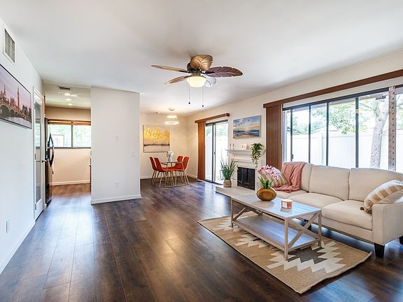 Do you own a hammock? The most desirable ONE-level END unit in the Annandale community comes with two large shady patios for you to enjoy California's great weather all year round! The townhome is move-in ready with fresh paint, newer top-quality engineered hardwood floors, and dual-pane windows. The open-concept living/dining room has a lovely fireplace, built-in shelves, and sliding doors leading to an x-large patio. The kitchen offers lots of cabinets, granite countertops, stainless steel appliances, a breakfast bar, and a butler's pantry. The primary bedroom has an en-suite bath with just remodeled big shower, a walk-in closet, and another patio. The other bedrooms are a good size and share a full bath. The unit is equipped with a washer and dryer, central air and heat, and ceiling fans. The unit comes with 1 carport space. Pet friendly (and friendly in general) Annandale community features a clubhouse and just renovated pool. The HOA fee includes earthquake insurance. The community is close to an award-winning Agoura High and other Las Virgines schools, Trader Joe's, fun restaurants and shopping places, the most scenic and beloved Chumash Park, equestrian trails, freeway access and Malibu beaches.