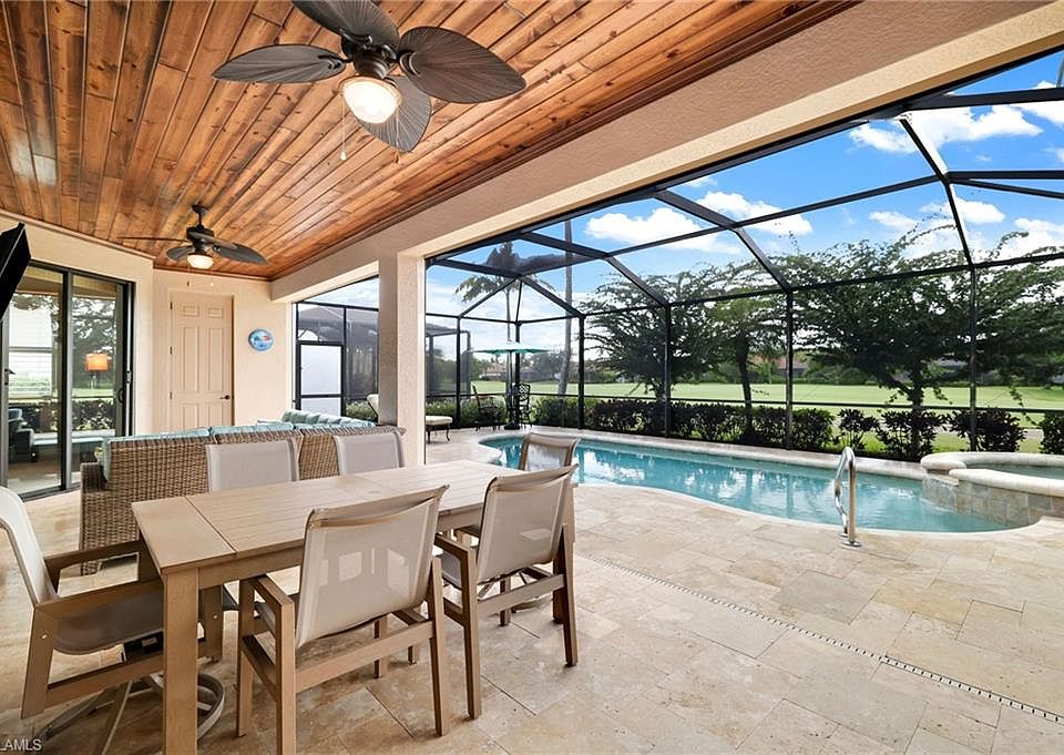 GOLF MEMBERSHIP INCLUDED! If you've dreamed of enjoying SWFL's stunning sunset vistas over the golf course, whenever you please, then this beautiful "Victoria" home is for you. Effortlessly entertain while utilizing the Built-In Outdoor Grill and the most outdoor sheltered living space in the "Executive Series." The home has been particularly cared for and polished with thoughtful upgrades such as a luxurious travertine pool deck, a Saltwater System Pool and Spa, an automatic roll down storm screen at the lanai, a warm toned wood plank ceiling at the lanai, Plantation Shutters and other custom window treatments, upgraded kitchen cabinets, impact rated windows and doors, and a lot more. New Water Heater as of July 2025. Bonita National has the best amenities in Southwest Florida highlighted by the resort-style pool with their showstopping rock waterfall and poolside bar and grill, championship-style golf with an over-sized practice facility and recently upgraded short game area, grand clubhouse with formal and informal dining, golf pro shop, card rooms, 8 Har-Tru lighted tennis courts, full service spa, and large fitness center. Located in the heart of SWFL, close to Bonita Beach, dining, shopping, RSW Airport, and the upcoming “Midtown at Bonita.” Pickleball and Bocce have been approved and are awaiting installation.