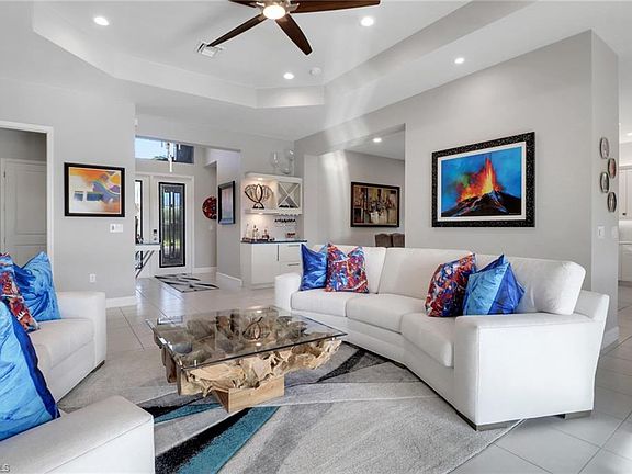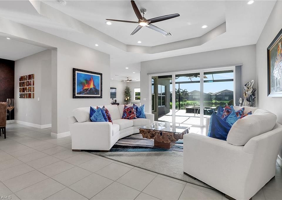 Welcome to your Florida dream home in the vibrant 55+ community of Valencia Bonita. This stunning pool home, enhanced with smart Wi-Fi hub integration, combines elegant design with modern convenience—offering the perfect blend of comfort, luxury, & peace of mind. The home has been beautifully furnished with custom-selected pieces designed to complement each space. The seller is highly flexible & open to including some or all furnishings! This home is set on a premium east-facing lakefront lot, & offers stunning sunrise views, a gas-heated saltwater pool and spa, picture-frame screen enclosure, and a summer kitchen with motorized rotisserie—perfect for morning coffee & evening entertaining. Inside, this Lydia floor plan offers 3 spacious bedrooms plus a den, arranged in a well-flowing split layout. Every detail has been thoughtfully upgraded—from tile & luxury vinyl plank flooring, to $10,000 in designer lighting, to remote-controlled window treatments that make daily living effortless. The gourmet kitchen has newer LG stainless appliances, large island, huge pantry, cabinet pull-outs, & an adjacent dry bar. The den features a full wall of custom built-ins for display, storage, or a home office. The laundry room offers custom cabinetry, LG washer/dryer, a wine cooler, utility sink, & a second refrigerator. Owned solar panels (with the current solar loan to be paid off by the sellers at closing) keep electric bills at just $26/month. Additional energy-efficient & high-tech upgrades include a tankless water heater, Sonos sound system, integrated TVs, & an Asus mesh Wi-Fi system for seamless whole-home connectivity. And when it comes to peace of mind, you’re covered with impact glass windows & doors, a whole-house Generac generator, & a remote-controlled hurricane screen to protect lanai furniture. The garage is insulated, climate-controlled with a mini-split A/C, & includes finished floors & generous storage—ideal for your tools, hobbies, or home gym. As a resident of Valencia Bonita, you’ll enjoy a lifestyle like no other. The gorgeous 45,000 sq ft clubhouse offers dining, a spa & nail salon, fitness center, Broadway-style entertainment, & a full social calendar. Outside, lounge by the sparkling resort-style pool, or enjoy a refreshing workout in the comfort of the shaded lap & resistance pools. There is also tennis, pickleball, bocce, sidewalks, & two dog parks—all just minutes from the Gulf beaches, fine dining, shopping, I-75, and RSW Airport. This is more than a home—it’s a lifestyle, & it’s waiting for you!
