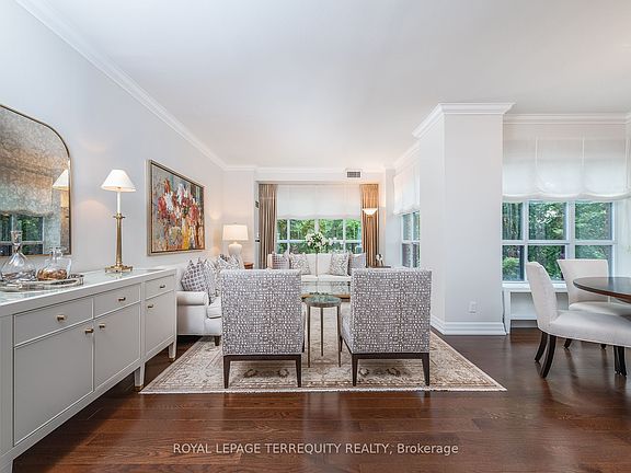 "Kingsway Condominiums" Quiet elegance wraps this professionally designed and renovated 1647 square foot suite by Karen Kayne Design. Sun filled corner location with floor to ceiling windows at the end of the hall providing ultimate privacy. The open gallery has sight lines to all principal rooms. Spacious living room with the option of reopening the roughed in gas fireplace. Formal dining room features French door walk out to the open balcony. A true gourmet cooks kitchen with top of the line appliances, quartzite stone counter, honed marble backsplash and extended custom cabinetry. Convenient breakfast room also opens onto the balcony. The den is a perfect spot to read or watch television. Primary suite has oodles of storage with walk in closet and built in wall wardrobe by Space Age Shelving. Both bathrooms have marble counters, floors and custom vanities. Engineered hardwood flooring and wool broadloom maintains an allergy free environment. This exceptional split bedroom floorplan is coveted within the building for flow and function. An exceptionally large locker and two side by side parking spots complete the package. Resort style amenities include: indoor swimming pool, gym, party room with kitchen, manicured English garden, guest suite, visitor parking and a full time concierge. Conveniently located by the Old Mill Subway or Royal York Grenview Ave. entrance, Humber River Trails and an easy stroll to "The Kingsway" or "Bloor West Village" shops and restaurants. A lifestyle for a lifetime.