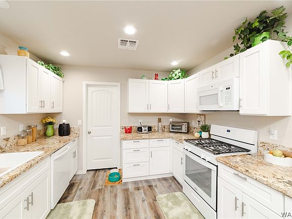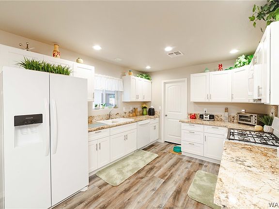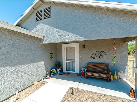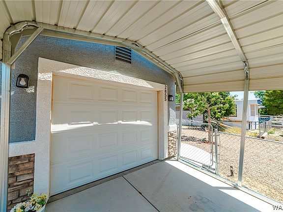 BETTER THAN NEW! Step into a new life in Kingman, Arizona with this 2-bedroom, 2-bathroom ranch house, located in the New Kingman Addition area. This 2022-built home is better than new with added amenities by the seller including all white appliances, a refrigerator with water and ice maker, a large stand-up freezer and shelving in the garage, glass doors in the master suite step-in shower, a cute front screen door, added fencing in the front yard for pets, carport, and window coverings. The property is conveniently close to local restaurants and shopping. It features single-story living, classic comfort, and a range of amenities. The interior is filled with natural light, stylish fixtures, neutral decor, and ceiling fans. The kitchen boasts beautiful granite countertops, white appliances, and an attractive open layout. The master bedroom includes a large walk-in closet and a private bath with a step-in shower. The second bedroom is located across the hall from the second bathroom and linen closet. Outside, there are front and back covered patios, an attached garage, and a fenced front and back yard.