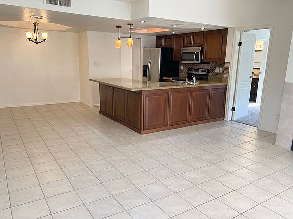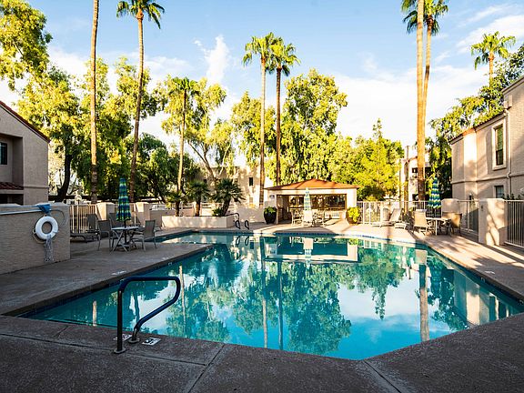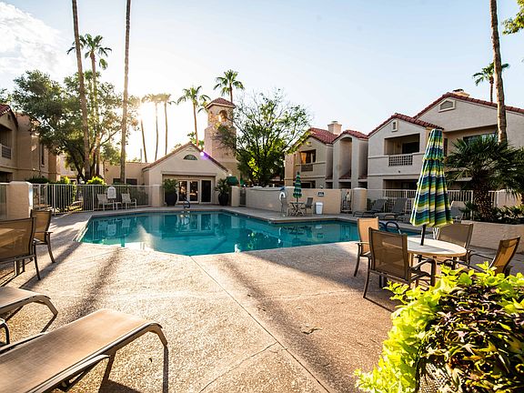 Spacious Mesa condo available now! High ceilings and great split floor plan. Flooring in main areas is tile and new carpet in the bedrooms, granite countertops in the kitchen, full size washer and dryer in unit, fully outfitted kitchen. Both bathrooms recently redone and new tile! The community is well maintained and beautifully landscaped, with a pool and spa, gas grills and exercise facility. The property is conveniently located near shopping, dining, and golf courses.