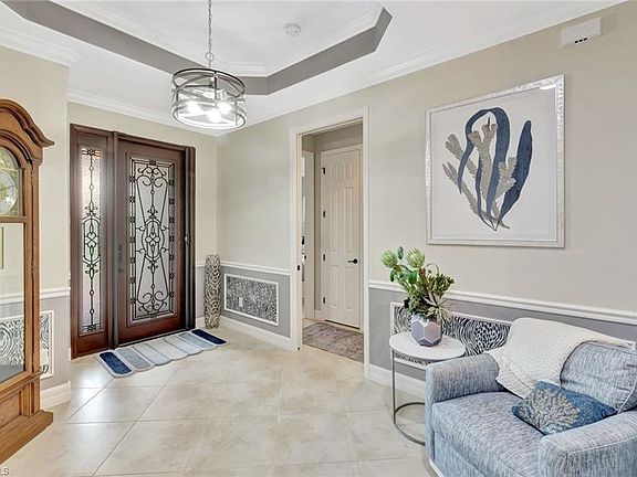 This beautiful 4-bedroom home includes a Golf Membership at the desirable Bonita National Golf & Country Club. Designed with comfort and style in mind, it features numerous upgrades. The driveway and lanai have been power-washed and sealed, and Super Screens have been added to enhance outdoor enjoyment while minimizing insects. The landscaping has been improved with two impressive large palms, adding a touch of tropical charm. Fresh paint in the lanai and foyer areas highlights elegant crown molding and a stunning chandelier, creating a welcoming entrance. Enjoy the atmosphere on the lanai, which is enhanced by a stylish lighted ceiling fan and custom landscape lighting that illuminates the surroundings for delightful evenings outside. The insulated garage door contributes to energy efficiency. Fresh paint throughout the home creates an inviting atmosphere, complemented by upgraded rheostat switches and convenient USB receptacles for modern living. Each room features crown molding and ceiling fans, enhancing both the aesthetic appeal and comfort. Custom closets and specialized lighting maximize organization and functionality. New air supply trunks and vent installations have been added in the primary bedroom to ensure optimal cooling for year-round comfort. The guest bathroom has been upgraded with elegant new vanity lights, a stylish custom mirror, towel bars, and additional hardware for convenience. The great room impresses with fresh sliding door window treatments, plantation shutters, and a ceiling fan, creating a warm and sophisticated setting, perfect for relaxation or entertaining. Concealed wiring for the TV maintains a clean and uncluttered look, allowing for a seamless flow in this elegant living space. This residence is more than just a house; it is a carefully designed sanctuary that harmoniously blends luxury living with leisure, making it the perfect retreat for you and your family.