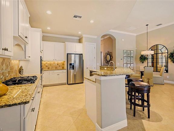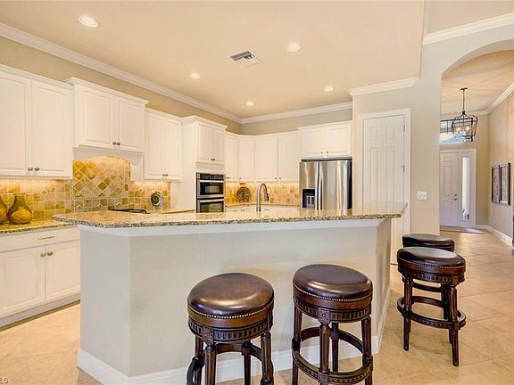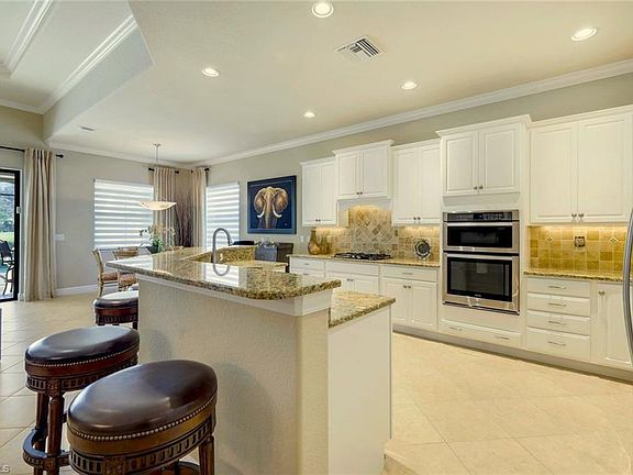 EVERYTHING YOU NEED, IMMEDIATELY! Meticulously maintained, Furnished & TURNKEY, this stunning Pool Home in the highly desirable Cordova at Spanish Wells offers the perfect blend of luxury, comfort, and Florida lifestyle living! NEW HVAC with 10-year warranty!! From the moment you arrive, the brick paver driveway, covered 12-ft entry, and grand foyer with soaring 12-ft ceilings set the tone for the elegance that awaits inside. Step through the welcoming foyer to find a thoughtfully designed open floor plan ideal for both entertaining and everyday living. The expansive Great Room features a coffered ceiling, crown molding, and seamless flow into the Formal Dining Area and Upgraded Gourmet Kitchen. Culinary enthusiasts will love the white cabinetry, granite countertops, Kitchen Aid GAS cooktop, Whirlpool convection wall oven and microwave, breakfast bar, and sunlit breakfast nook. Retreat to the Primary Suite, a true sanctuary with a coffered ceiling, dual walk-in closets, and a luxurious en-suite bath with his and hers vanities. Two additional guest bedrooms, a Den/Office with double door entry and wood flooring, a full bathroom, and a powder room are perfectly tucked away at the front of the home, offering privacy and flexibility for family or guests. The highlight of this home is its outdoor oasis. The covered lanai, protected by electric storm shutters, opens to a custom-designed pool with water feature, surrounded by elegant white travertine pavers—perfect for soaking up the Florida sun or enjoying peaceful evenings. Additional features include, oversized tile set on the diagonal, crown molding, and upgraded finishes throughout. Cordova at Spanish Wells includes a Social Membership, with the option to upgrade to full Golf Membership with immediate access. Enjoy formal and casual dining, tennis, pickleball, bocce, fitness center with classes, and community pool—all within minutes of world-class shopping, dining, and the pristine beaches of the Gulf of Mexico. SWFL International Airport is just 30 minutes away. Whether you're seeking a year-round residence or a seasonal retreat, this home delivers the ultimate in Southwest Florida living!