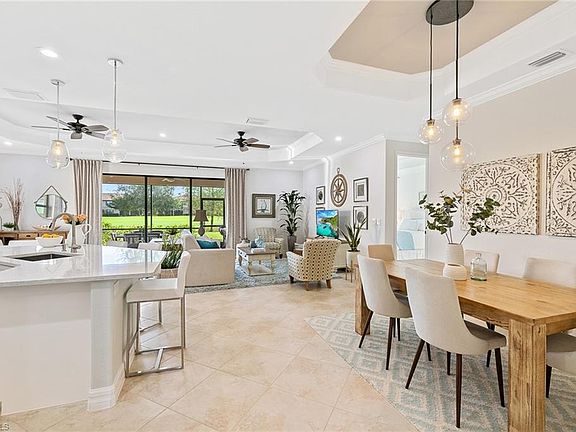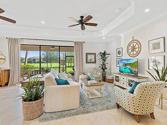 A FULL GOLF MEMBERSHIP IS AVAILABLE FOR TRANSFER. The property is rented for the 2025 season. Experience southern charm in the furnished "Victoria" floorplan home located in SWFL. Situated near Bonita Beach, restaurants, shops, and RSW Airport, you can enjoy serene sunrises over the pond and golf course from your lanai. Inside, the home boasts diagonal tile in shared spaces and plank tile in the bedrooms. The modern kitchen features quartz countertops and an island, complemented by top-of-the-line appliances. Other features include tray ceilings, crown molding, and impact-resistant windows and doors. The spacious lanai is equipped with a half bath and a grill. Bonita National offers amenities such as a resort-style pool, waterfall, bar and grill, championship golf, a clubhouse, dining, a pro shop, locker rooms, 8 tennis courts, a spa, and a fitness center. Dive into luxury in this home and experience the vibrancy of SWFL.